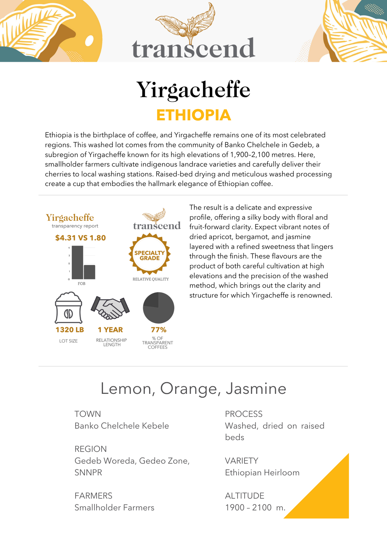 Ethiopia is the birthplace of coffee, and Yirgacheffe remains one of its most celebrated growing regions. This lot comes from smallholder farmers in the community of Banko Chelchele, located in Gedeb at elevations between 1,900 and 2,100 metres. Indigenous landrace varieties thrive here in rich soils and temperate conditions, producing coffees known for their bright, floral character.